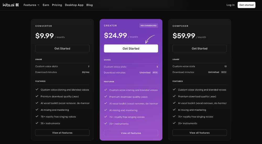 - Creator: $24.99/month, Custom voice slots 5, Unlimited Download.