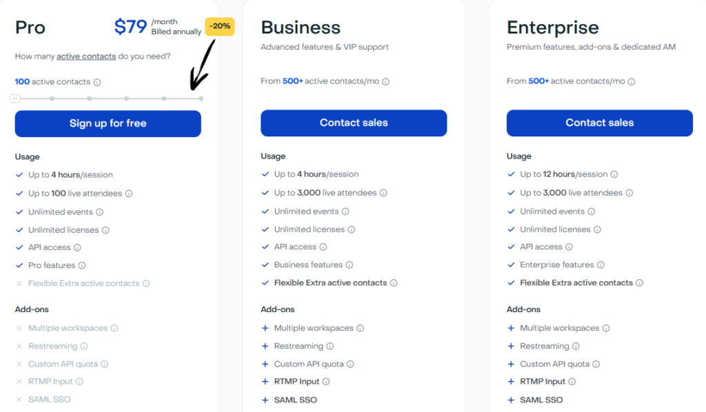 | Business | Contact sales | Unlimited events (up to 4 hours), unlimited registrants, all features included |