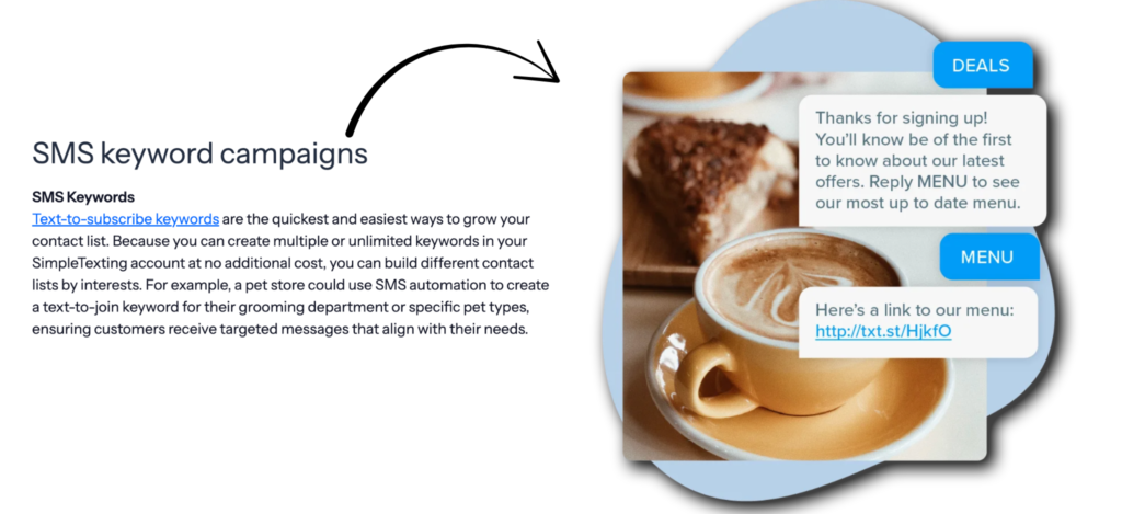 An SMS Keyword Campaign lets people sign up for your text marketing list by texting a specific keyword to your SimpleTexting number.