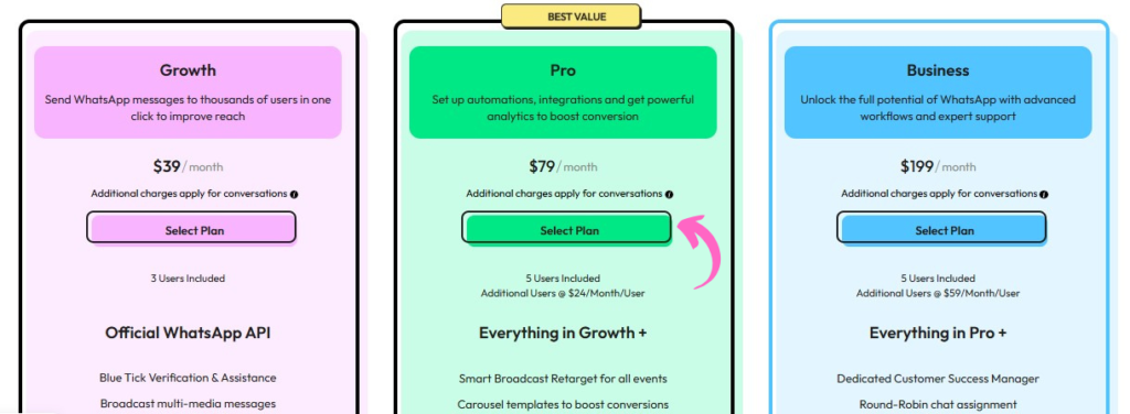 Wati is known for its ease of use. Its simple interface means you don’t need tech expertise, and simple conversational tools help simplify WhatsApp campaigns.